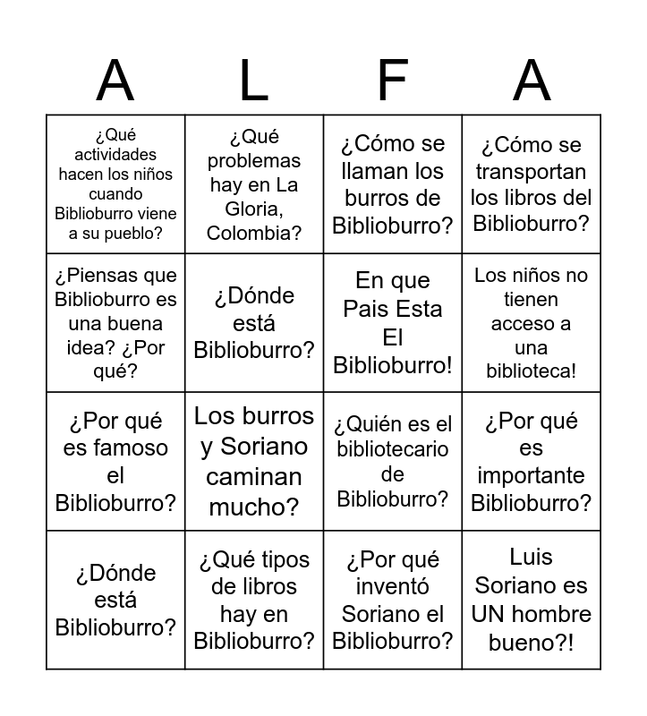 This bingo card has 16 words: ¿Qué tipos de libros hay en Biblioburro?, ¿Por qué es importante Biblioburro?, ¿Cómo se llaman los burros de Biblioburro?, ¿Qué actividades hacen los niños cuando Biblioburro viene a su pueblo?, ¿Por qué es famoso el Biblioburro?, ¿Qué problemas hay en La Gloria, Colombia?, ¿Quién es el bibliotecario de Biblioburro?, ¿Por qué inventó Soriano el Biblioburro?, ¿Piensas que Biblioburro es una buena idea? ¿Por qué?, ¿Dónde está Biblioburro?, ¿Dónde está Biblioburro?, ¿Cómo se transportan los libros del Biblioburro?, Los burros y Soriano caminan mucho?, Los niños no tienen acceso a una biblioteca!, En que Pais Esta El Biblioburro! and Luis Soriano es UN hombre bueno?!.