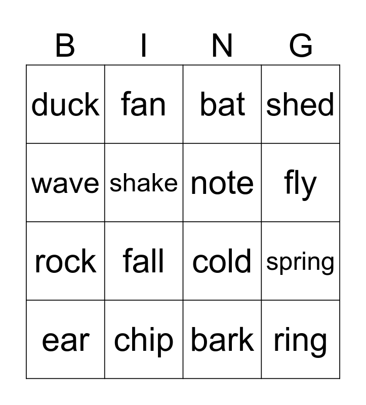 This bingo card has 16 words: chip, spring, bat, duck, rock, fan, cold, bark, wave, shake, ear, shed, fall, fly, note and ring.