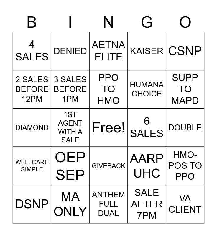 This bingo card has a free space and 24 words: OEP SEP, MA ONLY, PPO TO HMO, DSNP, CSNP, 4 SALES, 2 SALES BEFORE 12PM, DENIED, 6 SALES, GIVEBACK, HUMANA CHOICE, DIAMOND, AARP UHC, HMO-POS TO PPO, 3 SALES BEFORE 1PM, SALE AFTER 7PM, DOUBLE, AETNA ELITE, SUPP TO MAPD, 1ST AGENT WITH A SALE, VA CLIENT, WELLCARE SIMPLE, KAISER and ANTHEM FULL DUAL.