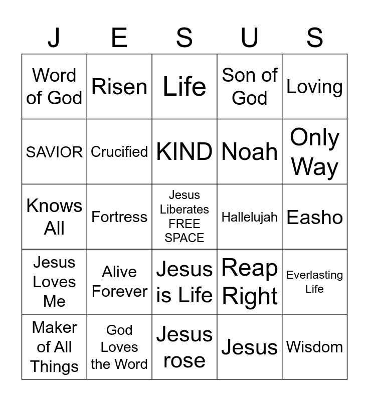 This bingo card has a free space and 75 words: The Way, Truth, Life, Salvation, Love, Favor, Goodness, Son, Powerful, Alpha, Fearless, Omega, KIND, SAVIOR, Rock, Fortress, Shield, Wisdom, Good, Loving, Caring, Knows All, Crucified, Risen, Son of God, Last Adam, Image of the Father, All Power, Creator, Eternal Life, Forgive Sins, No Other Name, Veracity, Reap Right, Only Way, Noah, Savior of the World, Yeshua, Easho, Jesus, Jesus Christ, Promises, Yes, I Believe, I'm a Believer, Overcome, Maker of All Things, Word of God, Translated, Enoch, God's Word is Truth, Jesus is Life, Impossible Possible, Faith Walker, God with You, God in You, Depend on Him, God Never Lies, Be Alive, Resurrection, Alive Forever, Eternity, Attract Blessings, Abundant Life, Personal Relationship, Hallelujah, Way, Truth, & Life, Speak the Word, Pray Daily, Everlasting Life, Jesus Loves Me, God Loves the Word, Jesus died so I could have Life, Jesus rose and Jesus shed His Blood.