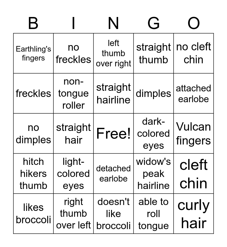 This bingo card has a free space and 24 words: light-colored eyes, right thumb over left, straight hairline, likes broccoli, no cleft chin, Earthling's fingers, freckles, no freckles, dark-colored eyes, detached earlobe, dimples, no dimples, widow's peak hairline, cleft chin, non-tongue roller, able to roll tongue, Vulcan fingers, left thumb over right, attached earlobe, straight hair, curly hair, hitch hikers thumb, straight thumb and doesn't like broccoli.