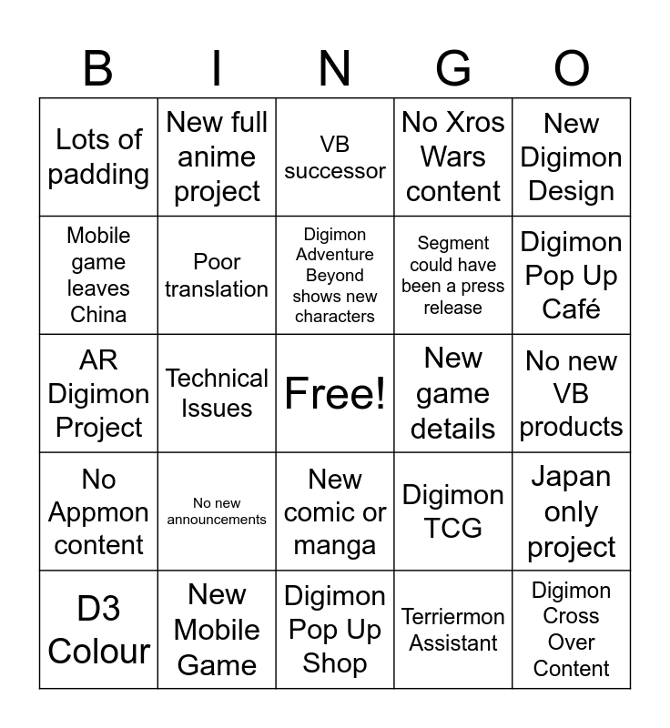 This bingo card has a free space and 24 words: No new announcements, New Mobile Game, Digimon Adventure Beyond shows new characters, D3 Colour, New Digimon Design, Lots of padding, Mobile game leaves China, New full anime project, New game details, New comic or manga, Segment could have been a press release, AR Digimon Project, Digimon TCG, Japan only project, Poor translation, Terriermon Assistant, No new VB products, VB successor, Digimon Pop Up Café, Technical Issues, Digimon Cross Over Content, No Appmon content, No Xros Wars content and Digimon Pop Up Shop.