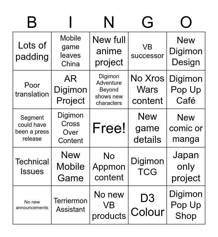 This bingo card has a free space and 24 words: No new announcements, New Mobile Game, Digimon Adventure Beyond shows new characters, D3 Colour, New Digimon Design, Lots of padding, Mobile game leaves China, New full anime project, New game details, New comic or manga, Segment could have been a press release, AR Digimon Project, Digimon TCG, Japan only project, Poor translation, Terriermon Assistant, No new VB products, VB successor, Digimon Pop Up Café, Technical Issues, Digimon Cross Over Content, No Appmon content, No Xros Wars content and Digimon Pop Up Shop.