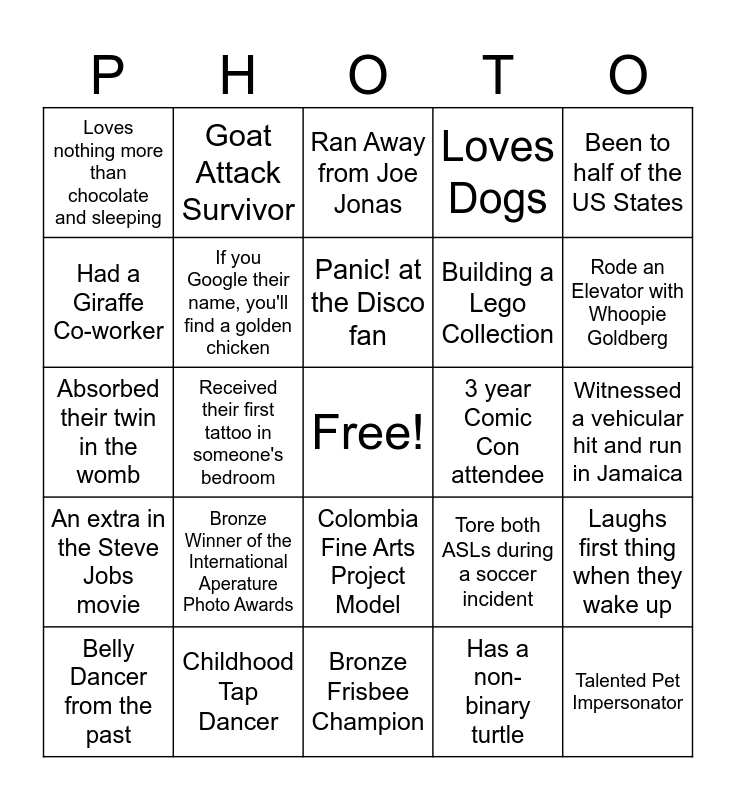 This bingo card has a free space and 24 words: Bronze Winner of the International Aperature Photo Awards, Childhood Tap Dancer, Panic! at the Disco fan, Belly Dancer from the past, Been to half of the US States, Loves nothing more than chocolate and sleeping, Had a Giraffe Co-worker, Goat Attack Survivor, 3 year Comic Con attendee, Colombia Fine Arts Project Model, Building a Lego Collection, Absorbed their twin in the womb, Tore both ASLs during a soccer incident, Laughs first thing when they wake up, If you Google their name, you'll find a golden chicken, Has a non-binary turtle, Witnessed a vehicular hit and run in Jamaica, Ran Away from Joe Jonas, Rode an Elevator with Whoopie Goldberg, Received their first tattoo in someone's bedroom, Talented Pet Impersonator, An extra in the Steve Jobs movie, Loves Dogs and Bronze Frisbee Champion.
