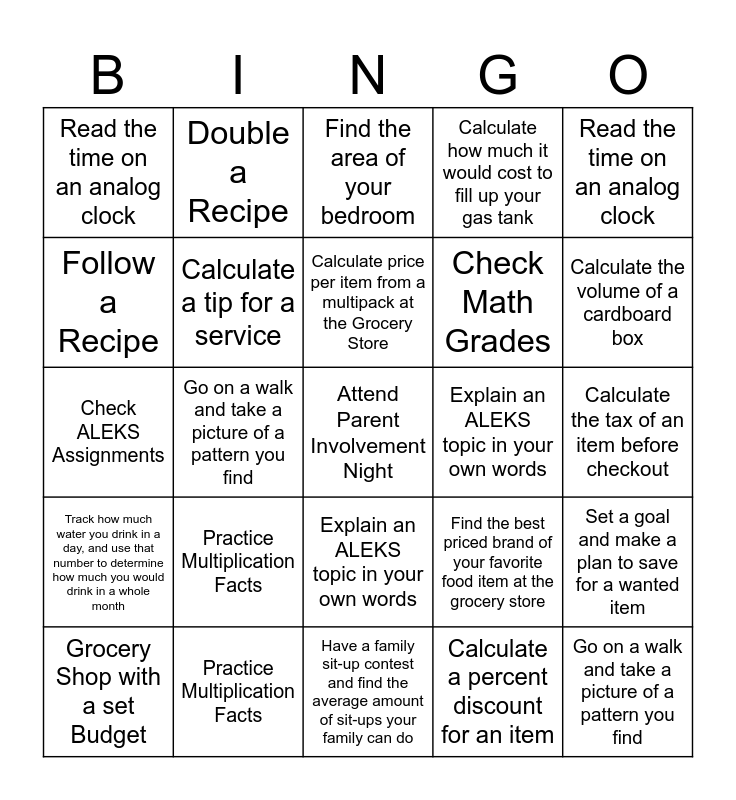 This bingo card has a free space and 24 words: Practice Multiplication Facts, Practice Multiplication Facts, Calculate price per item from a multipack at the Grocery Store, Grocery Shop with a set Budget, Read the time on an analog clock, Read the time on an analog clock, Follow a Recipe, Double a Recipe, Explain an ALEKS topic in your own words, Explain an ALEKS topic in your own words, Check Math Grades, Check ALEKS Assignments, Find the best priced brand of your favorite food item at the grocery store, Set a goal and make a plan to save for a wanted item, Calculate a tip for a service, Calculate a percent discount for an item, Calculate the tax of an item before checkout, Find the area of your bedroom, Calculate the volume of a cardboard box, Go on a walk and take a picture of a pattern you find, Go on a walk and take a picture of a pattern you find, Track how much water you drink in a day, and use that number to determine how much you would drink in a whole month, Calculate how much it would cost to fill up your gas tank and Have a family sit-up contest and find the average amount of sit-ups your family can do.