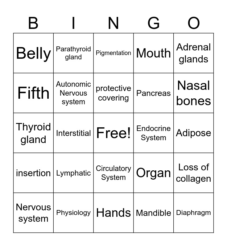This bingo card has a free space and 24 words: Lymphatic, Physiology, protective covering, Nervous system, Adrenal glands, Belly, Fifth, Parathyroid gland, Endocrine System, Circulatory System, Pancreas, Thyroid gland, Organ, Loss of collagen, Autonomic Nervous system, Mandible, Adipose, Pigmentation, Nasal bones, Interstitial, Diaphragm, insertion, Mouth and Hands.