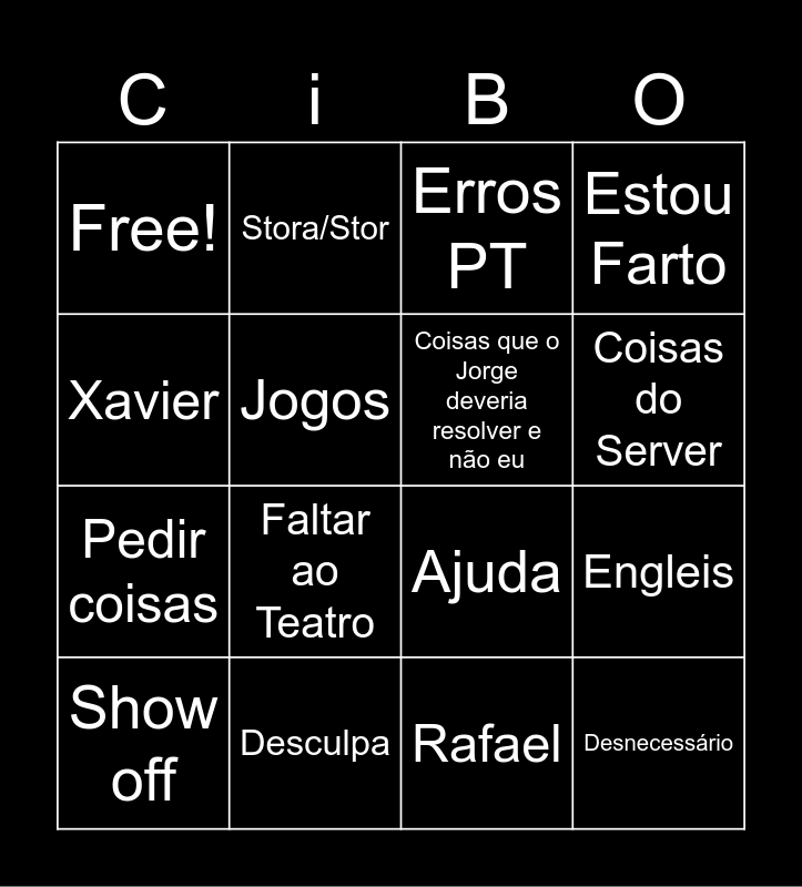 This bingo card has 16 words: Show off, Desculpa, Erros PT, Estou Farto, Xavier, Stora/Stor, Ajuda, Engleis, Free!, Jogos, Rafael, Coisas do Server, Pedir coisas, Faltar ao Teatro, Coisas que o Jorge deveria resolver e não eu and Desnecessário.