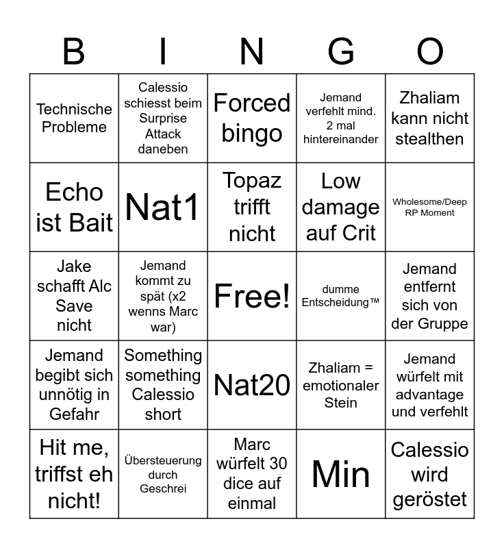 This bingo card has a free space and 30 words: Übersteuerung durch Geschrei, 10 Minuten Ablenkung durch Meme/Essen, Jemand kommt zu spät (x2 wenns Marc war), Kaffee/ Pinkelpause, Technische Probleme, Forced bingo, Nat1, Nat20, dumme Entscheidung™, Marc würfelt 30 dice auf einmal, Jemand entfernt sich von der Gruppe, Calessio wird geröstet, Min, Jake trifft was, Wholesome/Deep RP Moment, Streit, Zhaliam = emotionaler Stein, Jemand begibt sich unnötig in Gefahr, Something something Calessio short, Zhaliam kann nicht stealthen, Jake schafft Alc Save nicht, Jake rizzed jemanden, Calessio schiesst beim Surprise Attack daneben, Low damage auf Crit, Echo ist Bait, Jemand verfehlt mind. 2 mal hintereinander, Jemand würfelt mit advantage und verfehlt, Hit me, triffst eh nicht!, Topaz trifft nicht and Dirkin’ time.