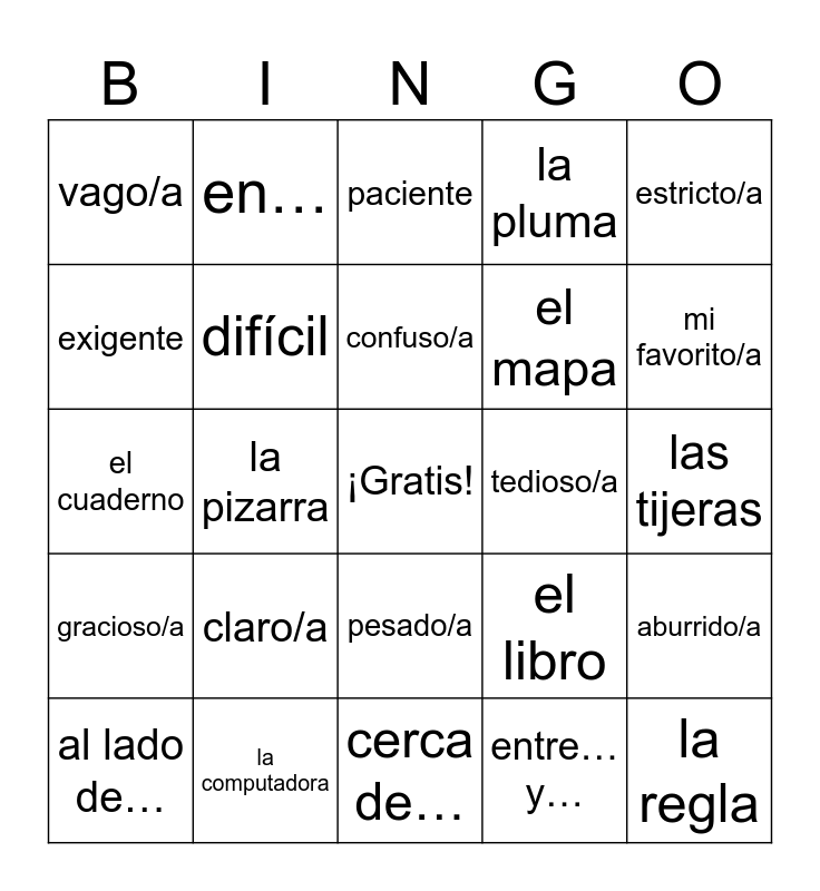 This bingo card has a free space and 37 words: el/la mejor, el/la peor, fácil, difícil, aburrido/a, claro/a, confuso/a, divertido/a, estricto/a, excelente, la pizarra, la pluma, la regla, las tijeras, exigente, gracioso/a, interesante, paciente, pesado/a, tedioso/a, vago/a, mi favorito/a, al lado de…, cerca de…, lejos de…, entre… y…, en…, los auriculares, el borrador, la calculadora, la carpeta, la computadora, el cuaderno, el lápiz, el libro, el mapa and el papel.