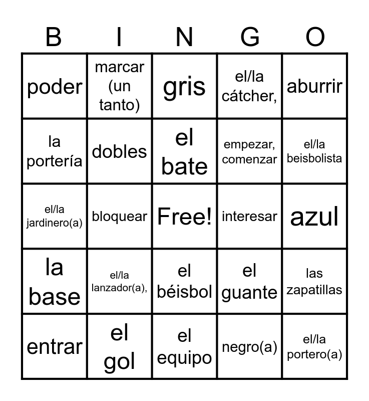 This bingo card has a free space and 93 words: los deportes, el fútbol, el béisbol, el básquetbol,, el baloncesto, el tenis, el partido, el juego, el equipo, el/la jugador(a), el/la aficionado(a), el/la espectador(a), el tanto, jugar (a), empezar, comenzar, volver, poder, marcar (un tanto), querer, perder, ganar, aplaudir, el campo de fútbol, el tiempo, el balón, el/la portero(a), la portería, el gol, lanzar, tocar, guardar, entrar, bloquear, meter (un gol), el campo de béisbol, el/la beisbolista, el/la bateador(a), el/la lanzador(a),, el/la pícher, el/la cátcher,, el/la receptor(a), el/la jardinero(a), el bate, el guante, el plato, la base, el jonrón, batear, correr, atrapar, la cancha, el cesto, la canasta, tirar, driblar (con), encestar, (basketball), la raqueta, la pelota, tennis), la red, individuales, dobles, golpear, pasar, devolver, por encima de, la camiseta, el pantalón corto, los calcetines largos, las zapatillas, ¿De qué color es?, el color, amarillo(a), anaranjado(a), azul, blanco(a), de color marrón, gris, negro(a), rojo(a), rosado(a), verde, gustar, interesar, aburrir, pensar, dormir, preferir, propio(a), ¡Qué pena!, Lo siento (mucho)., ¿Qué piensas de… ?, about . . . ? and ¡Bárbaro!.