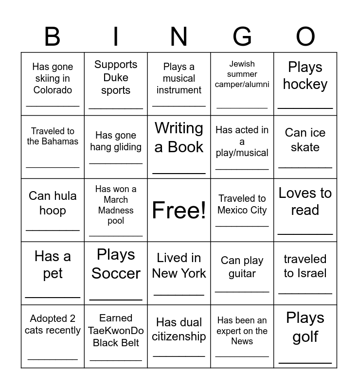 This bingo card has a free space and 24 words: Plays Soccer ______, Earned TaeKwonDo Black Belt _________, Writing a Book ______, Adopted 2 cats recently _________, Plays hockey _______, Has gone skiing in Colorado __________, Traveled to the Bahamas ___________, Supports Duke sports _________, Traveled to Mexico City __________, Lived in New York _______, Has acted in a play/musical __________, Can hula hoop ________, Can play guitar _________, traveled to Israel ________, Has gone hang gliding __________, Has been an expert on the News ___________, Loves to read _______, Plays a musical instrument __________, Can ice skate ________, Has won a March Madness pool ___________, Plays golf ______, Has a pet _______, Jewish summer camper/alumni ___________ and Has dual citizenship ________.