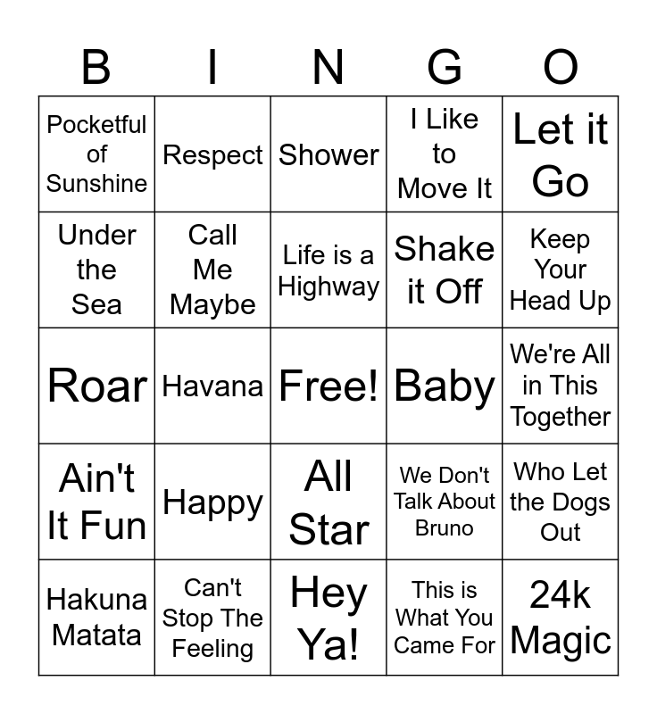 This bingo card has a free space and 24 words: Happy, Can't Stop The Feeling, Life is a Highway, Hakuna Matata, Let it Go, Pocketful of Sunshine, Under the Sea, Respect, Baby, All Star, Shake it Off, Roar, We Don't Talk About Bruno, Who Let the Dogs Out, Call Me Maybe, This is What You Came For, We're All in This Together, Shower, Keep Your Head Up, Havana, 24k Magic, Ain't It Fun, I Like to Move It and Hey Ya!.