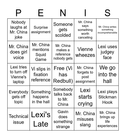 This bingo card has a free space and 26 words: Somebody talks back to Mr. China, Mr. China misuses slang, Mr. China makes a reference nobody gets, Lexi's Late, Mr. China writes something incomprehensible, Nobody laughs at Mr. China joke, Mr. China does girl voice, Surprise assignment, We go into the hall, Lexi starts crying, Vienne wheezes, Lexi tries to turn off Vienne's laptop, Lexi plays Stickman Hook, Technical issue, Vi slips in fixation reference, Mac says something dumb, Mr. China says something worth cancelling, Everybody gets off topic, Someone gets scolded, Mr. China brings up life experiences, Lexi uses judgey face, Gavin does something strange, Mr. China forgets to post assignment, Something happens in the hall, Mr. China mentions Squid Game and Literally anyone else answers a question.