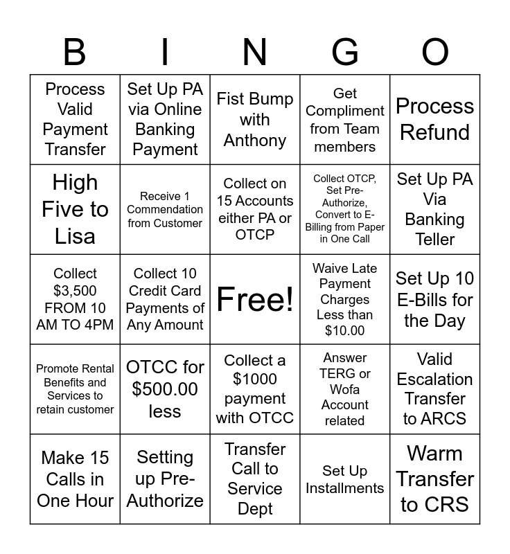 This bingo card has a free space and 24 words: OTCC for $500.00 less, Setting up Pre-Authorize, Collect on 15 Accounts either PA or OTCP, Make 15 Calls in One Hour, Process Refund, Process Valid Payment Transfer, High Five to Lisa, Set Up PA via Online Banking Payment, Waive Late Payment Charges Less than $10.00, Collect a $1000 payment with OTCC, Collect OTCP, Set Pre-Authorize, Convert to E-Billing from Paper in One Call, Collect $3,500 FROM 10 AM TO 4PM, Answer TERG or Wofa Account related, Valid Escalation Transfer to ARCS, Receive 1 Commendation from Customer, Set Up Installments, Set Up 10 E-Bills for the Day, Fist Bump with Anthony, Set Up PA Via Banking Teller, Collect 10 Credit Card Payments of Any Amount, Warm Transfer to CRS, Promote Rental Benefits and Services to retain customer, Get Compliment from Team members and Transfer Call to Service Dept.