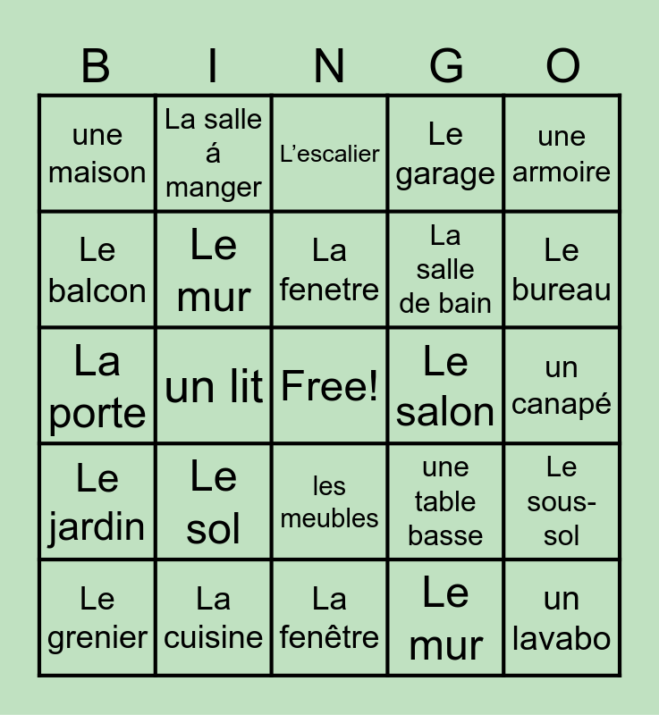 This bingo card has a free space and 28 words: Le sous-sol, La chambre, La salle de bain, Le mur, Le balcon, L’escalier, La salle á manger, Le jardin, Le salon, Le grenier, La porte, Le garage, La cuisine, La fenêtre, Le bureau, Les toilettes, Le sol, Le mur, La fenetre, les meubles, une maison, un appartement, un lavabo, un lit, un canapé, une table basse, une armoire and une télé.