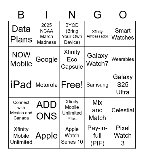 This bingo card has a free space and 29 words: Xfinity Mobile Unlimited, iPhone 16 Pro Max, Motorola, Tablets, Data Plans, BYOD (Bring Your Own Device), Google, ADD ONS, Samsung, Apple, Galaxy S25 Ultra, Pixel Watch 3, Apple Watch Series 10, Pay-in-full (PIF), Wearables, Global Travel Pass (International), Xfinity Mobile Unlimited Plus, Connect with Mexico and Canada, Smart Watches, iPad, Mix and Match, Multi-line pricing, Galaxy Watch7, NOW Mobile, Xfinity Ambassador, 2025 NCAA March Madness, Celestial, Xfinity Eco Capsule and Plus Up $100 trial — Watch and tablet trade-in.