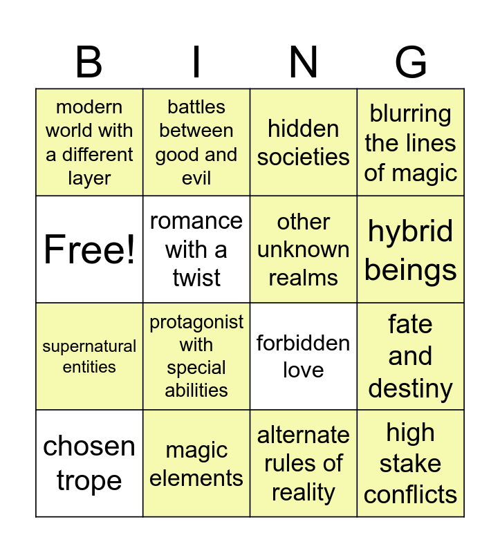This bingo card has 16 words: magic elements, fate and destiny, hidden societies, modern world with a different layer, supernatural entities, battles between good and evil, forbidden love, alternate rules of reality, Free!, romance with a twist, chosen trope, blurring the lines of magic, protagonist with special abilities, hybrid beings, other unknown realms and high stake conflicts.