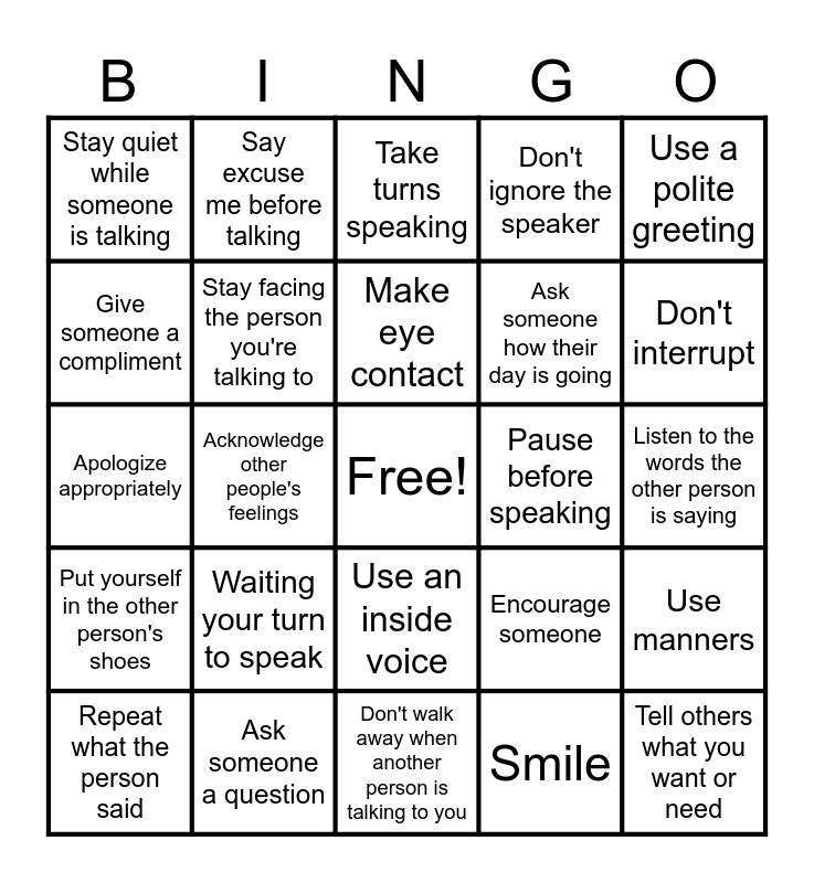 This bingo card has a free space and 24 words: Waiting your turn to speak, Ask someone a question, Make eye contact, Repeat what the person said, Use a polite greeting, Stay quiet while someone is talking, Give someone a compliment, Say excuse me before talking, Pause before speaking, Use an inside voice, Ask someone how their day is going, Apologize appropriately, Encourage someone, Use manners, Stay facing the person you're talking to, Smile, Listen to the words the other person is saying, Take turns speaking, Don't interrupt, Acknowledge other people's feelings, Tell others what you want or need, Put yourself in the other person's shoes, Don't ignore the speaker and Don't walk away when another person is talking to you.