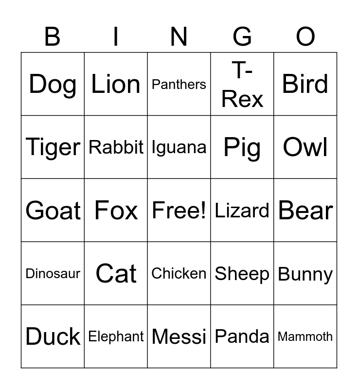 This bingo card has a free space and 24 words: Cat, Elephant, Iguana, Duck, Bird, Dog, Tiger, Lion, Lizard, Chicken, Pig, Goat, Sheep, Bunny, Rabbit, Panda, Bear, Panthers, Owl, Fox, Mammoth, Dinosaur, T-Rex and Messi.