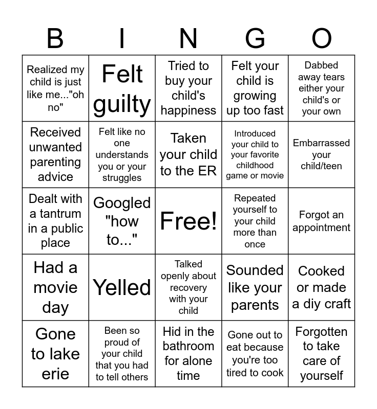 This bingo card has a free space and 24 words: Yelled, Been so proud of your child that you had to tell others, Taken your child to the ER, Gone to lake erie, Dabbed away tears either your child's or your own, Realized my child is just like me..."oh no", Received unwanted parenting advice, Felt guilty, Repeated yourself to your child more than once, Talked openly about recovery with your child, Introduced your child to your favorite childhood game or movie, Dealt with a tantrum in a public place, Sounded like your parents, Cooked or made a diy craft, Felt like no one understands you or your struggles, Gone out to eat because you're too tired to cook, Forgot an appointment, Tried to buy your child's happiness, Embarrassed your child/teen, Googled "how to...", Forgotten to take care of yourself, Had a movie day, Felt your child is growing up too fast and Hid in the bathroom for alone time.