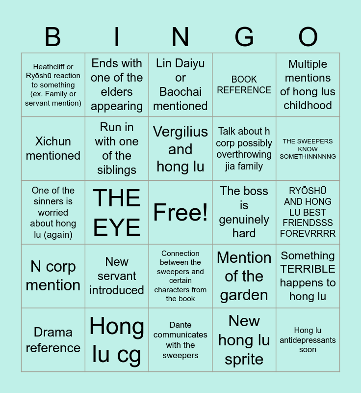 This bingo card has a free space and 24 words: New servant introduced, Hong lu cg, Vergilius and hong lu, Drama reference, Multiple mentions of hong lus childhood, Heathcliff or Ryōshū reaction to something (ex. Family or servant mention), Xichun mentioned, Ends with one of the elders appearing, The boss is genuinely hard, Connection between the sweepers and certain characters from the book, Talk about h corp possibly overthrowing jia family, One of the sinners is worried about hong lu (again), Mention of the garden, Something TERRIBLE happens to hong lu, Run in with one of the siblings, New hong lu sprite, RYŌSHŪ AND HONG LU BEST FRIENDSSS FOREVRRRR, Lin Daiyu or Baochai mentioned, THE SWEEPERS KNOW SOMETHINNNNNG, THE EYE, Hong lu antidepressants soon, N corp mention, BOOK REFERENCE and Dante communicates with the sweepers.