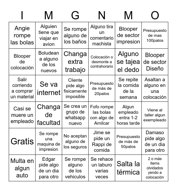 This bingo card has 37 words: Casi se muere un empleado, Se rompe una maquina de impresion, Se rompe alguno de los vehiculos, Alguno tira un comentario machista, Se repite la comida de la semana, Viene al taller algun exempleado, Angie rompe las bolas, Edgar pide algo de un dia para otro, Cliente pide algo fisicamente imposible, Jime se pide un Rappi de comida, Blooper de sector impresion, Blooper de sector Diseño, Blooper de colocación, Boludean a alguno de los nuevos, Se crea un grupo de whatsapp nuevo, Presupuesto de más de 20palos, Presupuesto de más de 50palos, Presupuesto de mas 100palos, Salir corriendo a comprar un material, Alguien tiene que viajar en avion, Se rompe alguno de los baños, Colocación o desmonte a contrahorario, Algun empleado entra 1-2 horas tarde, Damaso pide algo de un dia para otro, Gratis, Changa de facultad, Changa extra trabajo, Se rehace un laburo varias veces, Salta la térmica, 2 o más items olvidados yendo a colocación, +4 horas extras, Se va internet, No aceptan alguno de los seguros, Fofo rompe las bolas con algo de Amilcar, Alguno se tajea el dedo, Asaltan a alguno en una colocación and Multa en algun auto.