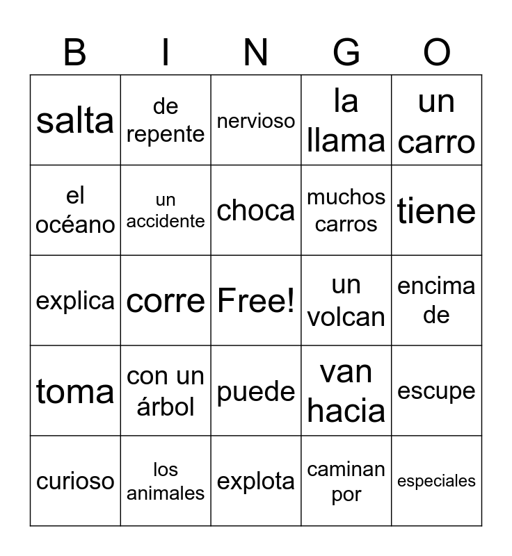 This bingo card has a free space and 27 words: van hacia, quiere, muchos carros, explota, el océano, nervioso, de repente, toma, un volcan, escupe, explica, la llama, curioso, los animales, tiene, la tortuga grande, un accidente, choca, con un árbol, salta, encima de, caminan por, corre, especiales, puede, un carro and una cerbatana.