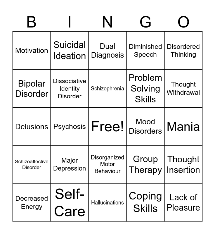 This bingo card has a free space and 24 words: Major Depression, Self-Care, Schizophrenia, Decreased Energy, Disordered Thinking, Motivation, Bipolar Disorder, Suicidal Ideation, Mood Disorders, Disorganized Motor Behaviour, Problem Solving Skills, Delusions, Group Therapy, Thought Insertion, Dissociative Identity Disorder, Coping Skills, Mania, Dual Diagnosis, Thought Withdrawal, Psychosis, Lack of Pleasure, Schizoaffective Disorder, Diminished Speech and Hallucinations.