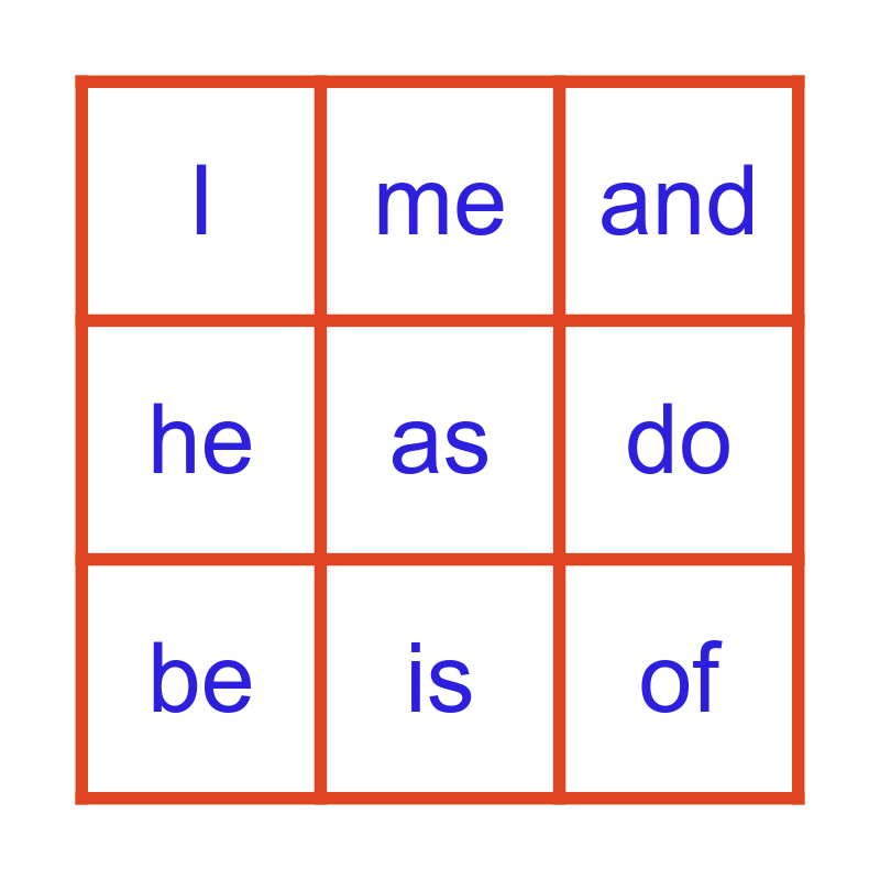 This bingo card has 15 words: the, a, and, I, is, as, said, to, do, of, see, he, be, me and from.