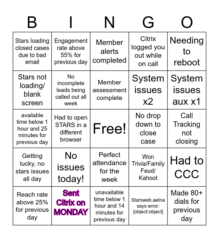 This bingo card has a free space and 24 words: No issues today!, Sent Citrix on MONDAY, Member assessment complete, Reach rate above 25% for previous day, Needing to reboot, Stars loading closed cases due to bad email, Stars not loading/ blank screen, Engagement rate above 55% for previous day, No drop down to close case, Perfect attendance for the week, System issues x2, available time below 1 hour and 25 minutes for previous day, Won Trivia/Family Feud/ Kahoot, Had to CCC, No incomplete leads being called out all week, Starsweb.aetna says error:[object:object], Call Tracking not closing, Member alerts completed, System issues aux x1, Had to open STARS in a different browser, Made 80+ dials for previous day, Getting lucky, no stars issues all day, Citrix logged you out while on call and unavailable time below 1 hour and 14 minutes for previous day.