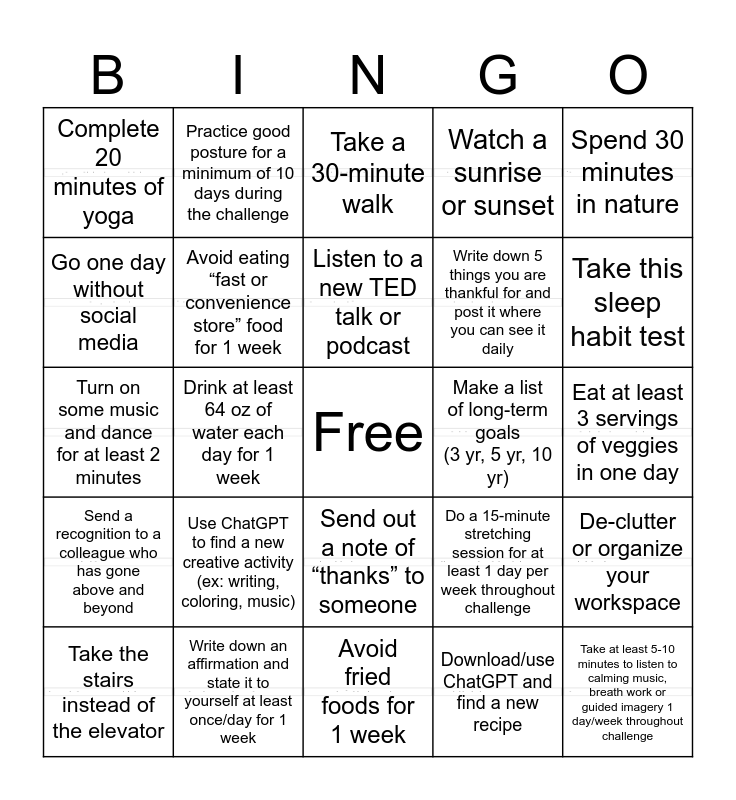 This bingo card has 22 images, a free space and 24 words: Use ChatGPT to find a new creative activity (ex: writing, coloring, music), Write down an affirmation and state it to yourself at least once/day for 1 week, Listen to a new TED talk or podcast, Take the stairs instead of the elevator, Spend 30 minutes in nature, Complete 20 minutes of yoga, Go one day without social media, Practice good posture for a minimum of 10 days during the challenge, Make a list of long-term goals (3 yr, 5 yr, 10 yr), Send out a note of “thanks” to someone, Write down 5 things you are thankful for and post it where you can see it daily, Turn on some music and dance for at least 2 minutes, Do a 15-minute stretching session for at least 1 day per week throughout challenge, De-clutter or organize your workspace, Avoid eating “fast or convenience store” food for 1 week, Download/use ChatGPT and find a new recipe, Eat at least 3 servings of veggies in one day, Take a 30-minute walk, Take this sleep habit test, Drink at least 64 oz of water each day for 1 week, Take at least 5-10 minutes to listen to calming music, breath work or guided imagery 1 day/week throughout challenge, Send a recognition to a colleague who has gone above and beyond, Watch a sunrise or sunset and Avoid fried foods for 1 week.