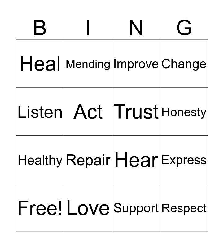 This bingo card has a free space and 15 words: Free!, Respect, Improve, Heal, Honesty, Listen, Repair, Support, Act, Healthy, Express, Change, Trust, Mending and Love.