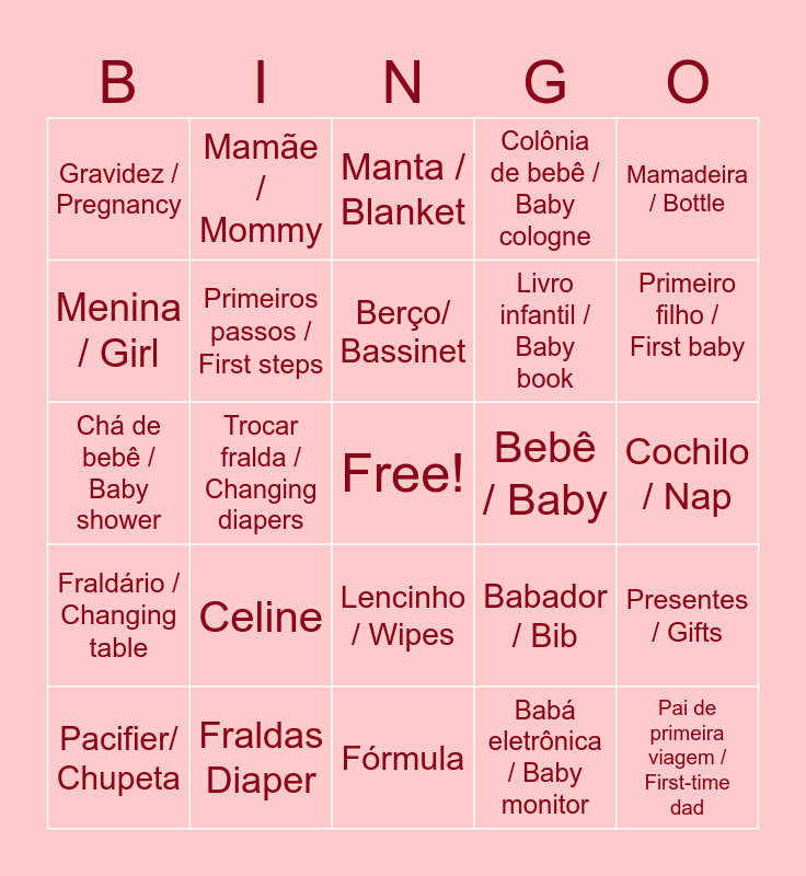 This bingo card has a free space and 24 words: Celine, Fraldas Diaper, Berço/ Bassinet, Pacifier/ Chupeta, Mamadeira / Bottle, Gravidez / Pregnancy, Menina / Girl, Mamãe / Mommy, Bebê / Baby, Lencinho / Wipes, Livro infantil / Baby book, Chá de bebê / Baby shower, Babador / Bib, Presentes / Gifts, Primeiros passos / First steps, Babá eletrônica / Baby monitor, Cochilo / Nap, Manta / Blanket, Primeiro filho / First baby, Trocar fralda / Changing diapers, Pai de primeira viagem / First-time dad, Fraldário / Changing table, Colônia de bebê / Baby cologne and Fórmula.