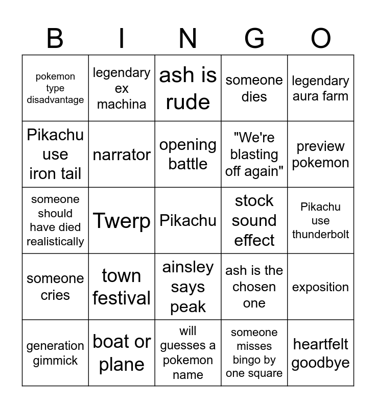 This bingo card has a free space and 38 words: Swimming in clothes, hanging on ledge, someone has powers, narrator, exposition, town festival, opening battle, pop song, legendary aura farm, "We're blasting off again", Twerp, someone dies, heartfelt goodbye, Pikachu use thunderbolt, Pikachu use iron tail, someone cries, weird 3d animation, ash is rude, ash is hungry or eats, stock sound effect, pokemon type disadvantage, boat or plane, preview pokemon, generation gimmick, ben pronounces a pokemon name wrong, will guesses a pokemon name, an argument breaks out, gwen does a silly voice, "I wish pokemon were real", insane feat of strength, woman hype, ainsley says peak, someone misses bingo by one square, legendary ex machina, Telepathy, ash is the chosen one, someone should have died realistically and Everyone come out.