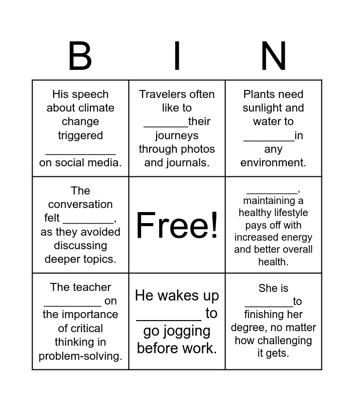 This bingo card has a free space and 8 words: _________, maintaining a healthy lifestyle pays off with increased energy and better overall health., Plants need sunlight and water to ________in any environment., Travelers often like to _______their journeys through photos and journals., The teacher _________ on the importance of critical thinking in problem-solving., His speech about climate change triggered ___________ on social media., She is ________to finishing her degree, no matter how challenging it gets., The conversation felt ________, as they avoided discussing deeper topics. and He wakes up ________ to go jogging before work..