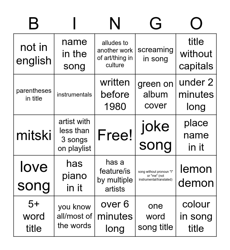 This bingo card has a free space and 28 words: lemon demon, gay people, green on album cover, one word song title, parentheses in title, alludes to another work of art/thing in culture, name in the song, love song, joke song, 5+ word title, mitski, screaming in song, you know all/most of the words, over 6 minutes long, under 2 minutes long, marked explicit by spotify, has piano in it, instrumentals, written before 1980, has a feature/is by multiple artists, not in english, from a soundtrack, colour in song title, artist with less than 3 songs on playlist, place name in it, song without pronoun "I" or "me" (not instrumental/translated), title without capitals and title track.