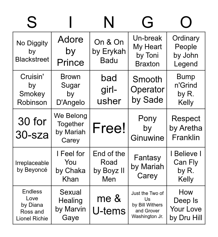 This bingo card has a free space and 69 words: Superstition by Stevie Wonder, Respect by Aretha Franklin, I Will Always Love You by Whitney Houston, Let's Stay Together by Al Green, Sexual Healing by Marvin Gaye, No Scrubs by TLC, Un-break My Heart by Toni Braxton, Say My Name by Destiny's Child, Ordinary People by John Legend, If I Ain't Got You by Alicia Keys, I Believe I Can Fly by R. Kelly, Waterfalls by TLC, No Diggity by Blackstreet, On & On by Erykah Badu, Crazy in Love by Beyoncé featuring Jay-Z, We Belong Together by Mariah Carey, End of the Road by Boyz II Men, Smooth Operator by Sade, Rock With You by Michael Jackson, Irreplaceable by Beyoncé, Pony by Ginuwine, Fantasy by Mariah Carey, Bump n'Grind by R. Kelly, That's the Way Love Goes by Janet Jackson, Killing Me Softly with His Song by Fugees, My Boo by Usher and Alicia Keys, Can We Talk by Tevin Campbell, I Swear by All-4-One, Just the Two of Us by Bill Withers and Grover Washington Jr., You Make Me Wanna... by Usher, Adore by Prince, No One by Alicia Keys, Remember the Time by Michael Jackson, Ain't Nobody by Chaka Khan, I Wanna Dance with Somebody by Whitney Houston, My Girl by The Temptations, Lean on Me by Bill Withers, When a Man Loves a Woman by Percy Sledge, Cruisin' by Smokey Robinson, Let’s Get It On by Marvin Gaye, I Feel for You by Chaka Khan, How Deep Is Your Love by Dru Hill, Don't Let Go by En Vogue, Best Part by Daniel Caesar featuring H.E.R., Before I Let Go by Maze featuring Frankie Beverly, Endless Love by Diana Ross and Lionel Richie, Slow Jam by Usher featuring Monica, Ascension by Maxwell, Back to Life by Soul II Soul, Brown Sugar by D'Angelo, bad girl-usher, anxiety-doechii, residual-chris brown, me & U-tems, snooze-sza, when it comes you-friday, mutt-leon thomas, icu-coco jones, folded-kehlani, 30 for 30-sza, burning blue-Mariah the scientist, In your eyes-snoh Aalegra, Here we go-coco jones, made for me-Muni long, Cant be friends-Trey songs, Whats my name-Rhianna, Before you walk out my life-Monica, Miss independant-Ne-yo and feels Good-Tony,Toni,Tone.
