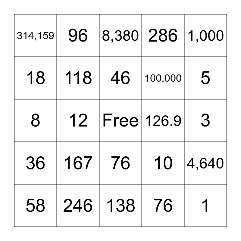 This bingo card has a free space and 24 words: 167, 246, 46, 58, 1,000, 314,159, 18, 96, 126.9, 76, 100,000, 8, 10, 4,640, 118, 76, 3, 8,380, 5, 12, 1, 36, 286 and 138.