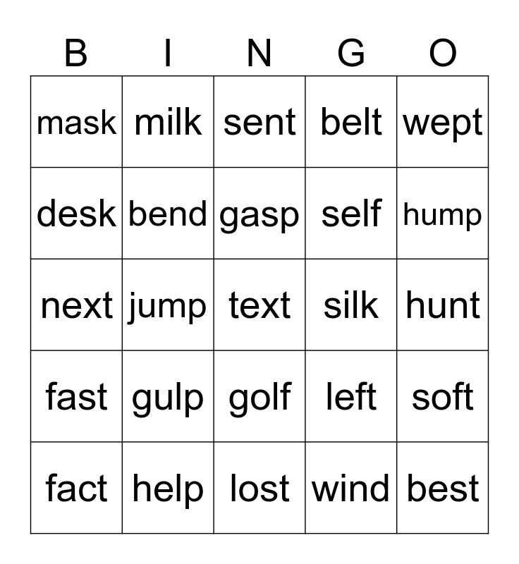 This bingo card has a free space and 24 words: gulp, help, gasp, fact, wept, mask, desk, milk, silk, golf, self, next, left, soft, bend, wind, hunt, sent, hump, jump, best, fast, belt and lost.