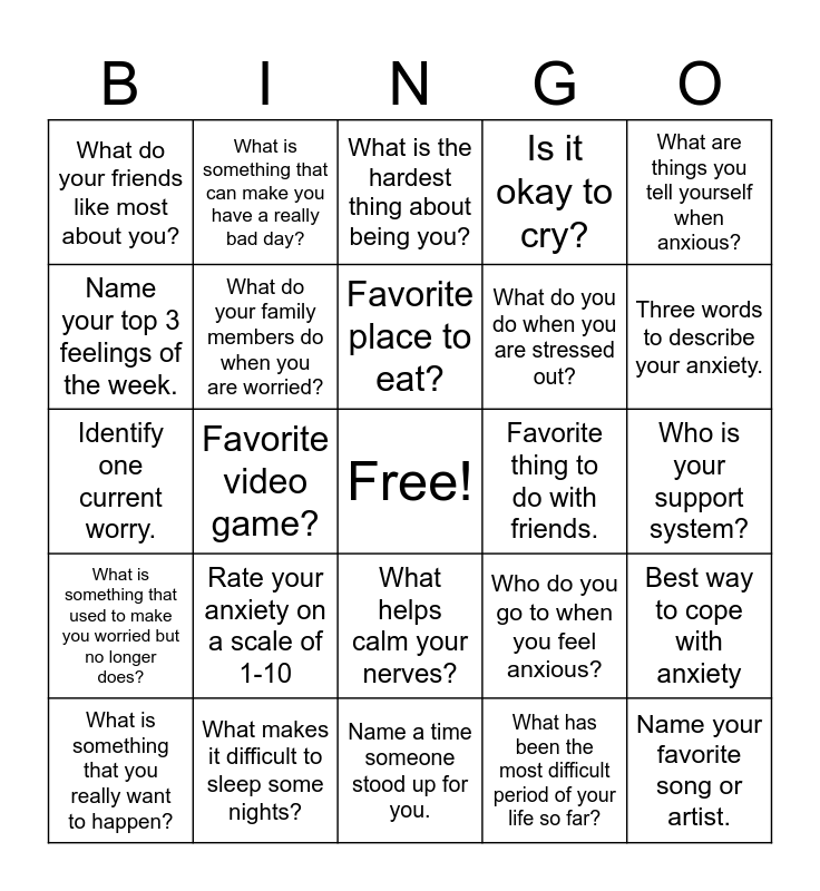 This bingo card has a free space and 24 words: Rate your anxiety on a scale of 1-10, What makes it difficult to sleep some nights?, Favorite place to eat?, What is something that you really want to happen?, What are things you tell yourself when anxious?, What do your friends like most about you?, Name your top 3 feelings of the week., What is something that can make you have a really bad day?, Favorite thing to do with friends., What helps calm your nerves?, What do you do when you are stressed out?, Identify one current worry., Who do you go to when you feel anxious?, Best way to cope with anxiety, What do your family members do when you are worried?, What has been the most difficult period of your life so far?, Who is your support system?, What is the hardest thing about being you?, Three words to describe your anxiety., Favorite video game?, Name your favorite song or artist., What is something that used to make you worried but no longer does?, Is it okay to cry? and Name a time someone stood up for you..