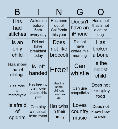 This bingo card has a free space and 24 words: Has been to the movie theatre this year, Can play a musical instrument, Does not like broccoli, Is afraid of spiders, Has a pet that is not a cat or dog, Has had stitches, Is an only child, Wakes up before 6am every day, Can whistle, Has the same birthday month as you, Did not have coffee this morning, Has more than 4 siblings, Can use chopsticks, Does not like spicy food, Did not have breakfast today, Loves country music, Is the oldest child, Has been out of California this year, Has broken a bone, Is left handed, Does not know how to swim, Has rode a motorcycle, Doesn't have an iPhone and Has twins in their family.