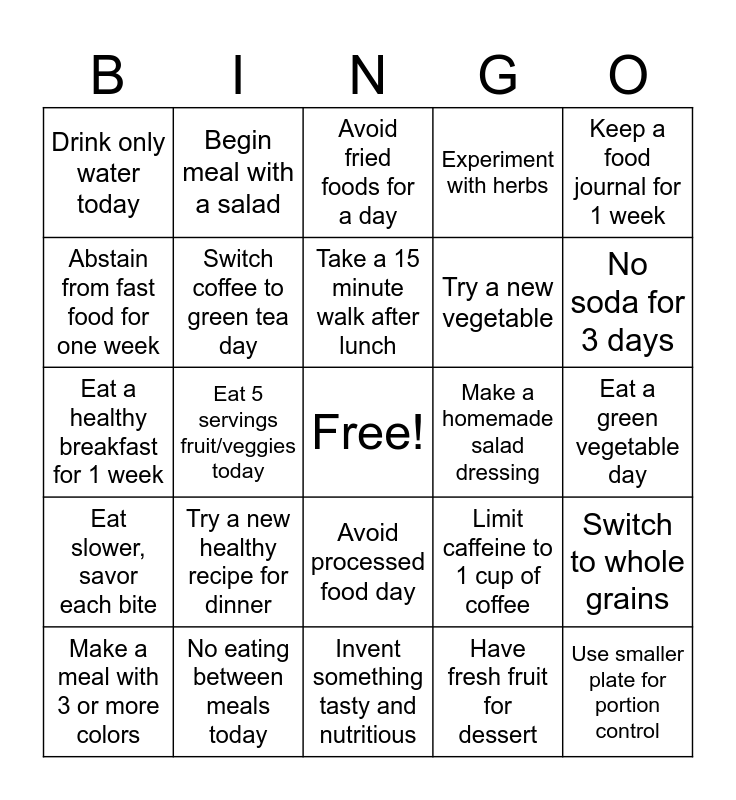 This bingo card has a free space and 24 words: Try a new healthy recipe for dinner, No eating between meals today, Take a 15 minute walk after lunch, Make a meal with 3 or more colors, Keep a food journal for 1 week, Drink only water today, Abstain from fast food for one week, Begin meal with a salad, Make a homemade salad dressing, Avoid processed food day, Try a new vegetable, Eat a healthy breakfast for 1 week, Limit caffeine to 1 cup of coffee, Switch to whole grains, Switch coffee to green tea day, Have fresh fruit for dessert, Eat a green vegetable day, Avoid fried foods for a day, No soda for 3 days, Eat 5 servings fruit/veggies today, Use smaller plate for portion control, Eat slower, savor each bite, Experiment with herbs and Invent something tasty and nutritious.