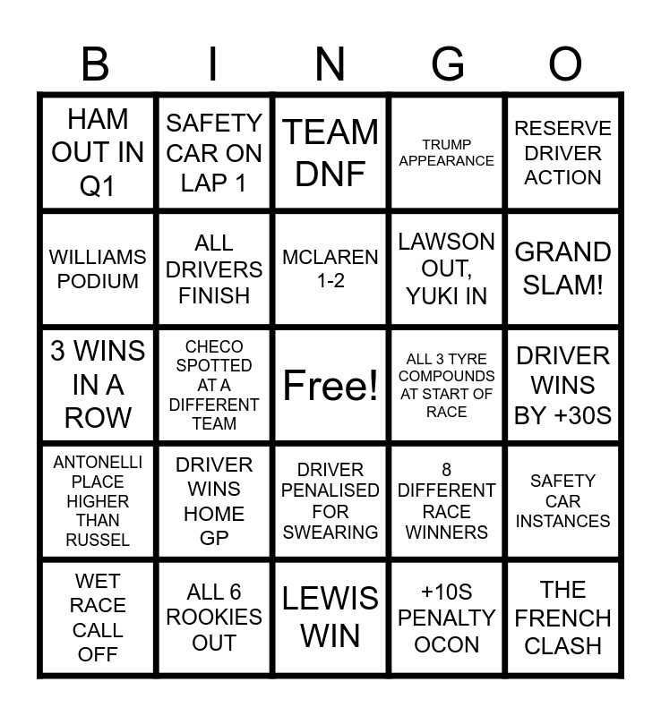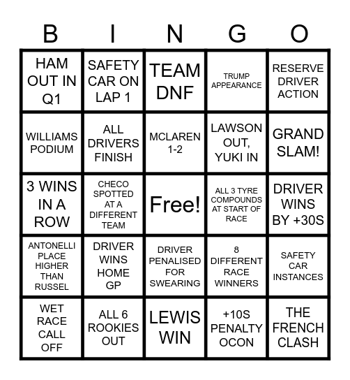 This bingo card has a free space and 24 words: DRIVER WINS HOME GP, ALL 6 ROOKIES OUT, MCLAREN 1-2, WET RACE CALL OFF, RESERVE DRIVER ACTION, HAM OUT IN Q1, WILLIAMS PODIUM, SAFETY CAR ON LAP 1, ALL 3 TYRE COMPOUNDS AT START OF RACE, DRIVER PENALISED FOR SWEARING, LAWSON OUT, YUKI IN, 3 WINS IN A ROW, 8 DIFFERENT RACE WINNERS, SAFETY CAR INSTANCES, ALL DRIVERS FINISH, +10S PENALTY OCON, DRIVER WINS BY +30S, TEAM DNF, GRAND SLAM!, CHECO SPOTTED AT A DIFFERENT TEAM, THE FRENCH CLASH, ANTONELLI PLACE HIGHER THAN RUSSEL, TRUMP APPEARANCE and LEWIS WIN.