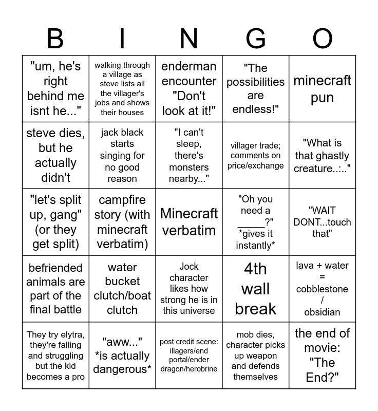 This bingo card has a free space and 24 words: water bucket clutch/boat clutch, "aww..." *is actually dangerous*, "I can't sleep, there's monsters nearby...", They try elytra, they're falling and struggling but the kid becomes a pro, minecraft pun, "um, he's right behind me isnt he...", steve dies, but he actually didn't, walking through a village as steve lists all the villager's jobs and shows their houses, "Oh you need a _____?" *gives it instantly*, Jock character likes how strong he is in this universe, villager trade; comments on price/exchange, "let's split up, gang" (or they get split), 4th wall break, lava + water = cobblestone / obsidian, jack black starts singing for no good reason, mob dies, character picks up weapon and defends themselves, "WAIT DONT...touch that", enderman encounter "Don't look at it!", "What is that ghastly creature..:..", campfire story (with minecraft verbatim), the end of movie: "The End?", befriended animals are part of the final battle, "The possibilities are endless!" and post credit scene: illagers/end portal/ender dragon/herobrine.