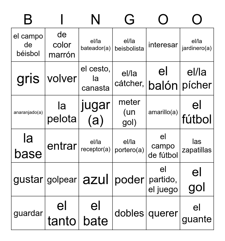 This bingo card has 91 words: Free!, los deportes, el fútbol, el béisbol, el básquetbol,, el baloncesto, el tenis, el partido, el juego, el equipo, el/la jugador(a), el/la aficionado(a), el/la espectador(a), el tanto, jugar (a), empezar, comenzar, volver, poder, querer, marcar (un tanto), perder, ganar, aplaudir, el campo de fútbol, el tiempo, el balón, el/la portero(a), la portería, el gol, lanzar, tocar, guardar, entrar, bloquear, meter (un gol), el campo de béisbol, el/la beisbolista, el/la bateador(a), el/la lanzador(a),, el/la pícher, el/la cátcher,, el/la receptor(a), el/la jardinero(a), el bate, el guante, el plato, la base, el jonrón, batear, correr, atrapar, la cancha, el cesto, la canasta, tirar, driblar (con), encestar, la raqueta, la pelota, la red, individuales, dobles, golpear, pasar, devolver, por encima de, la camiseta, el pantalón corto, los calcetines largos, las zapatillas, ¿De qué color es?, el color, amarillo(a), anaranjado(a), azul, blanco(a), de color marrón, gris, negro(a), rojo(a), rosado(a), verde, gustar, interesar, aburrir, pensar, dormir, preferir, propio(a), ¡Qué pena!, Lo siento (mucho)., ¿Qué piensas de… ? and ¡Bárbaro!.