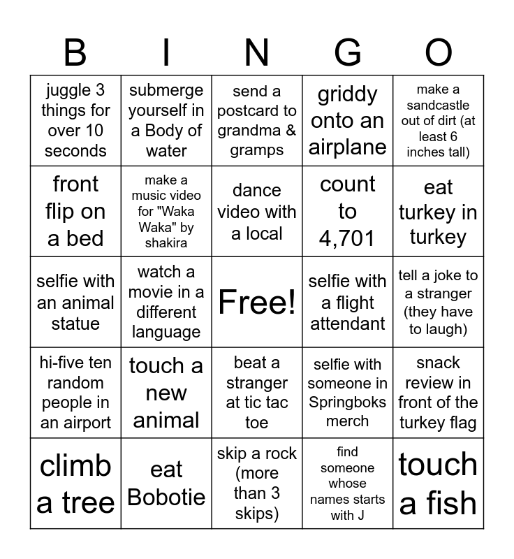 This bingo card has a free space and 24 words: touch a new animal, eat Bobotie, dance video with a local, climb a tree, make a sandcastle out of dirt (at least 6 inches tall), juggle 3 things for over 10 seconds, front flip on a bed, submerge yourself in a Body of water, selfie with a flight attendant, beat a stranger at tic tac toe, count to 4,701, selfie with an animal statue, selfie with someone in Springboks merch, snack review in front of the turkey flag, make a music video for "Waka Waka" by shakira, find someone whose names starts with J, tell a joke to a stranger (they have to laugh), send a postcard to grandma & gramps, eat turkey in turkey, watch a movie in a different language, touch a fish, hi-five ten random people in an airport, griddy onto an airplane and skip a rock (more than 3 skips).
