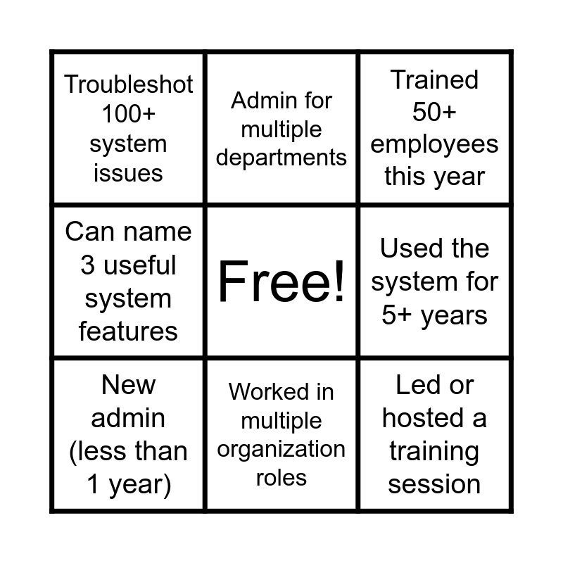 This bingo card has a free space and 8 words: Used the system for 5+ years, Trained 50+ employees this year, Admin for multiple departments, New admin (less than 1 year), Troubleshot 100+ system issues, Led or hosted a training session, Can name 3 useful system features and Worked in multiple organization roles.