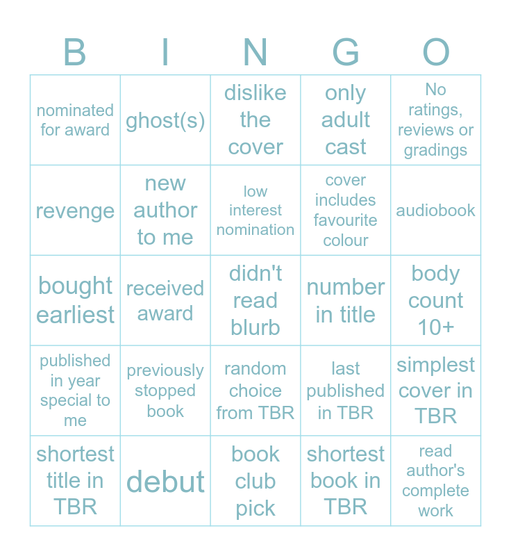 This bingo card has a free space and 24 words: previously stopped book, debut, low interest nomination, shortest title in TBR, No ratings, reviews or gradings, nominated for award, revenge, ghost(s), number in title, random choice from TBR, cover includes favourite colour, bought earliest, last published in TBR, simplest cover in TBR, new author to me, shortest book in TBR, body count 10+, dislike the cover, audiobook, received award, read author's complete work, published in year special to me, only adult cast and book club pick.