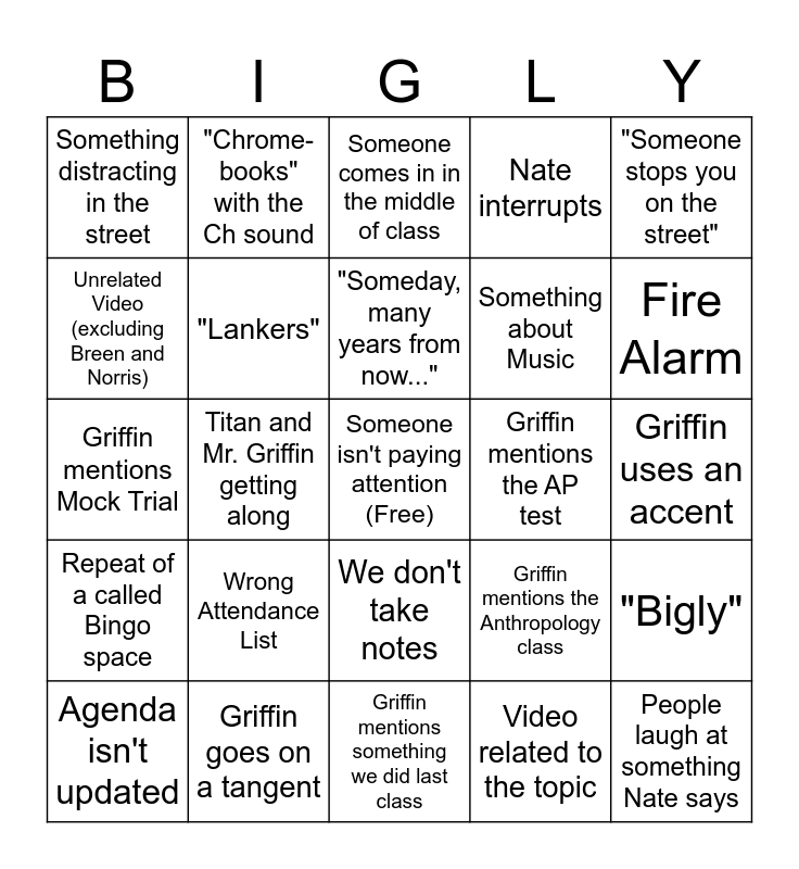 This bingo card has a free space and 38 words: Griffin starts class with a story, Neil Breen, Chuck Norris, "Lankers", "Bigly", Wrong Attendance List, "Someday, many years from now...", Softball Practice, "Someone stops you on the street", Something about Music, Titan and Mr. Griffin getting along, Nate interrupts, People laugh at something Nate says, Griffin uses an accent, Unrelated Video (excluding Breen and Norris), Repeat of a called Bingo space, There's a test, Someone comes in in the middle of class, No HW, Griffin mentions the AP test, Something distracting in the street, Griffin goes on a tangent, Fire Alarm, Agenda isn't updated, Alex has food, Griffin mentions something we did last class, We aren't given enough time for something, The lights are off, Griffin does his jog thing, Ali needs to charge his phone, Nate uses ChatGPT, We don't take notes, Video related to the topic, "Chrome-books" with the Ch sound, Starts the class with Today In History, Griffin mentions the Anthropology class, Griffin mentions Mock Trial and 2 people go to the bathroom at the same time.