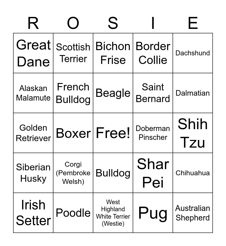 This bingo card has a free space and 40 words: Labrador Retriever, Golden Retriever, German Shepherd, French Bulldog, Poodle, Bulldog, Beagle, Rottweiler, Dachshund, Siberian Husky, Boxer, Border Collie, Australian Shepherd, Shih Tzu, Doberman Pinscher, Corgi (Pembroke Welsh), Old English Sheepdog, Great Dane, Maltese, Bichon Frise, Chihuahua, Pug, Saint Bernard, Alaskan Malamute, Newfoundland, Akita, Samoyed, Boston Terrier, Greyhound, Bernese Mountain Dog, Cavalier King Charles Spaniel, Irish Setter, Weimaraner, Shar Pei, Dalmatian, West Highland White Terrier (Westie), Jack Russell Terrier, Miniature Schnauzer, Scottish Terrier and Vizsla.